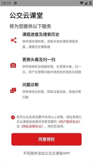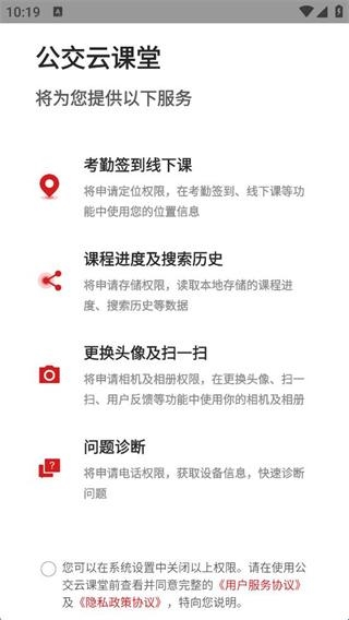 1、首先,下载并打开公交云课堂app,需要用户仔细阅读隐私协议和用户协议。